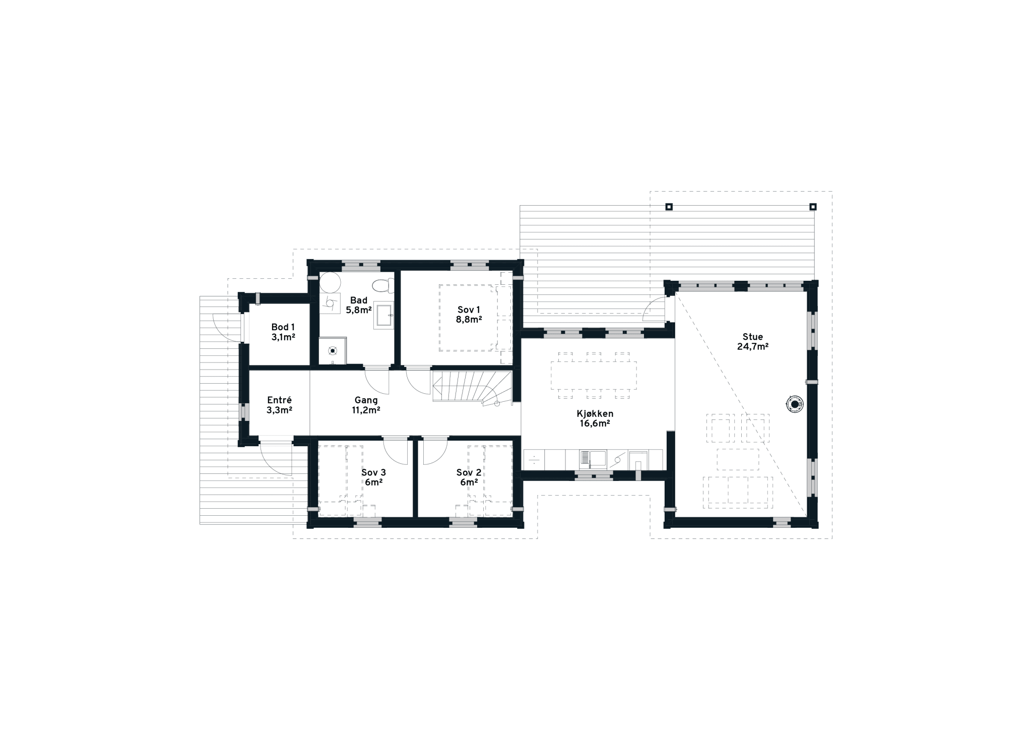 *Nøkkelferdig leveranse betyr totalentreprise over mur med kjøkken, elektriker og rørlegger som sideentrepriser. Standard kjøkken, VVS og elektroleveranse er inkludert i nøkkelferdig pris.