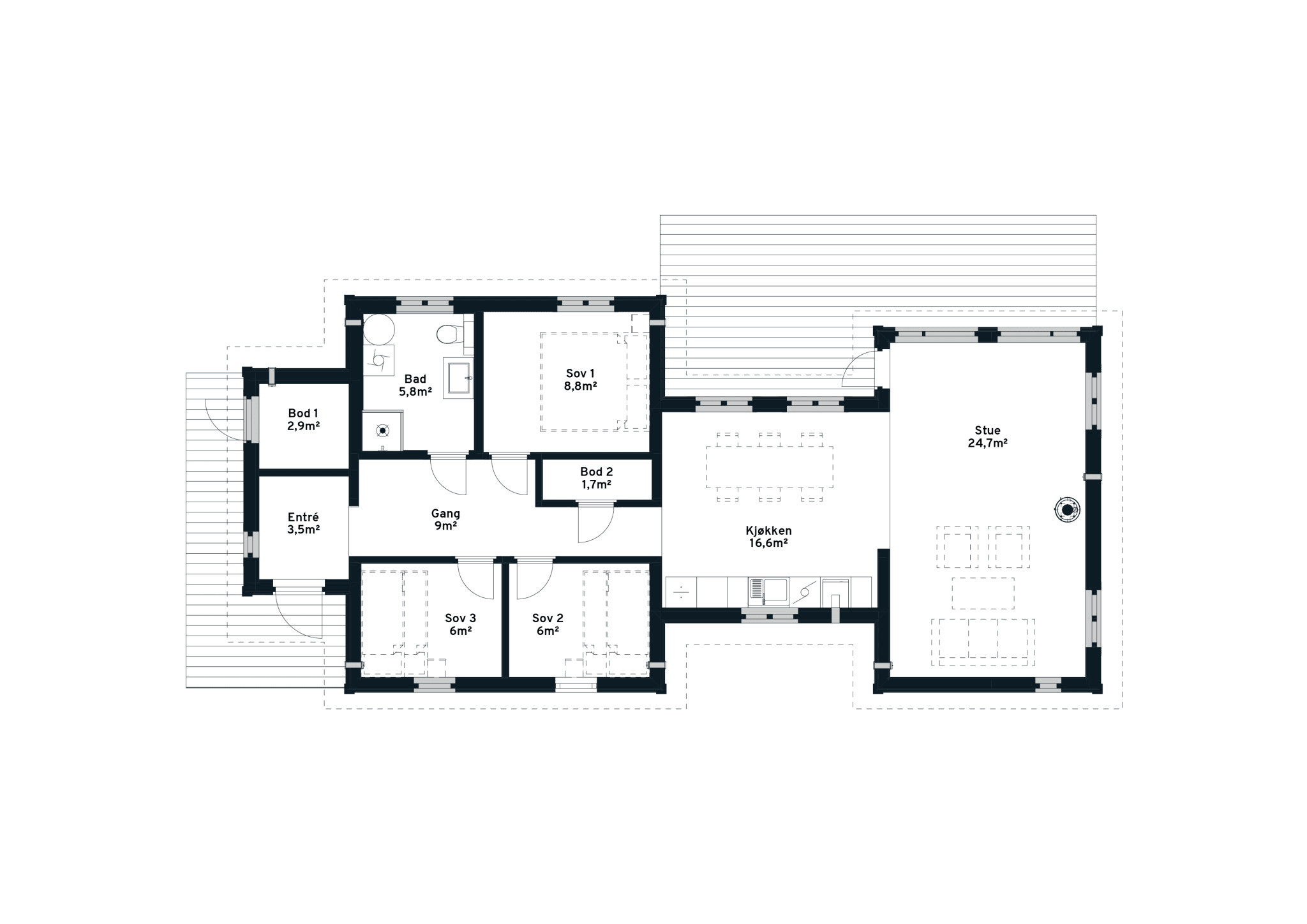 *Nøkkelferdig leveranse betyr totalentreprise over mur med kjøkken, elektriker og rørlegger som sideentrepriser. Standard kjøkken, VVS og elektroleveranse er inkludert i nøkkelferdig pris.
